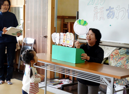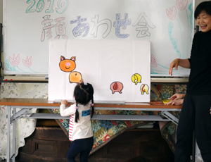 10:15〜 受付 10:35〜エンパワメントMOMO ・大型絵本「おべんとうバス」 ・手あそび「おべんとう」 ・絵本「パンツのはきかた」 ・ペープサート「大きなかぶ」 ・手あそび「あたまかたひざぽん」 ・絵本「わたしのからだよ」 「くだものだーれ?」 「ハグくまさん」 11:15〜 年間予定説明 スタッフ紹介 2019年度子育てひろば『あおぞら』の初めてのイベント『顔あわせ会』を行いました。 昨年度好評だった『エンパワメントMOMO』さんに来ていただいて、楽しい時間を過ごしました。 やさしい笑顔と声での大型絵本や手遊びで、子ども達もお母さんもどんどん引き込まれていきました。 絵本「ハグくまさん」と同じようにお母さんにぎゅーっとしてもらってエンパワメントMOMOさんの時間は終わり、最後に新スタッフの紹介をし、年間予定を伝えて解散となりました。 |