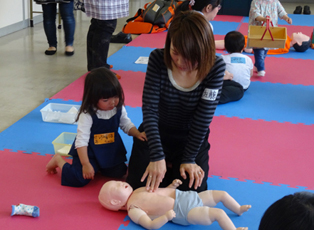 自分の子どもが突然倒れた時や、倒れている人を見かけた時、心臓と呼吸が止まっていたら119番通報と心肺蘇生が必要です。それを、落ち着いて、慌てないで行なうことができるように、笠岡消防署の消防士に教えていただきました。 心肺蘇生は、胸骨圧迫と人工呼吸とAEDを使います。 現在AEDは、公共機関やコンビニに置いてあります。 119番に電話して、救急車が到着するまで平均8〜9分かかります。 その間に胸骨圧迫を続けることで救命につながります。と教えてもらいました。 2グループにわかれてまず、小学生サイズと、乳児サイズの人形を使い、胸骨圧迫と人工呼吸の練習をしました。経験している親も多く、スムーズに行なうことができました。 AEDを含めた練習では、"我が子がプールでおぼれた時"や"道を歩いてると人が倒れていた時"など現実的な設定をすることで、より身近に感じ、気を引き締めて練習することができました。 途中の休憩時間にも、親からから消防士に熱心に質問する場面がありました。 今回学んだ救命処置を、実際使う時がないことを祈りますが、いざという時に落ち着いて行動できるためには、このような機会に慣れておきたいと思いました。 |