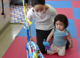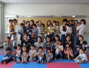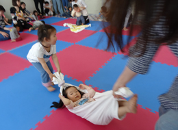 昨年度からの継続している方も多いですが、輪になって布のサイコロをバトン代わりに子どもの名前と年齢をお母さんが1人ずつ自己紹介をした後、スタッフも自己紹介をし、ひよこクラブの年間の行事予定を紹介。 準備運動でアンパンマン体操をすると、初めて踊る子もいて、みんなが踊るのを見ながら楽しそうに踊る姿がありました。 水分補給のための休憩をはさんで、二列に並んで、親子で手をつないでマットを飛び越えたり、親子で見つめあいながらバスタオルリレーをしたり、お菓子とりでも、ロープにぶら下がった袋を取りに、ゴールで待ってるお母さんの所にハイハイで頑張った子や、一人で走って取りに行けた子や、親子で一緒にゴールできた子もいました。 親子でたくさんふれあえることができ、体を動かして楽しめた会になりました。 |