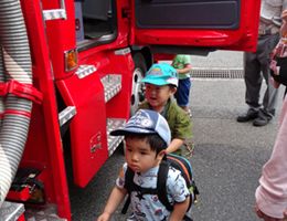 | ◎内 容 ・救急車&消防車の説明、乗車体験 ・ミニ消防服試着体験 ・訓練見学 ・集合写真 みんな大好き働く車がたくさんある笠岡消防署に見学に行きました。 ずらりと並んだ救急車、消防車の説明を聞き、運転席に座って写真を撮りました。救急車に乗せてもらい、たくさんある機会、装置を見せてもらいました。 子どもたちは、本物そっくりのミニ消防服を着て記念撮影も楽しみました。 最後に、消防士さんの訓練を目の前で見学させてもらい、大きな声を出し、高い塔から塔へつないだロープを移動していく様子や、要救護者を救助する姿を間近に見て、感動しました。 私たちの日常の安心安全が、消防士さんの日頃の訓練の上に守られていることに、改めて感じた 1日となりました。 |
