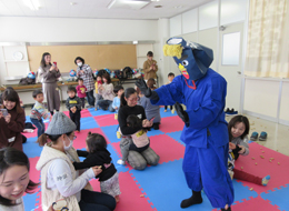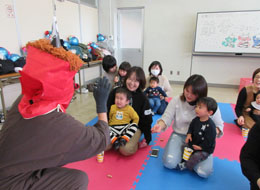 今年も1年元気に過ごせますようにとの願いを込めて節分の会を行いました。 いつもの手あそびからはじまり、紙芝居"ふくはうち おにはうち"ではお母さんの膝の上で真剣に聞いていました。踊り「おにのパンツ」では音楽に合わせてつよいぞ!のポーズもバッチリ決まっていました。工作ではボールに顔のパーツや花紙で作った髪の毛をマスキングテープで貼り鬼を作り、上手に出来上がった鬼を持って記念撮影をしました。みんなに豆を配ったところでドアを叩く音が・・・。 赤鬼と青鬼がやってきました!さぁ、みんなで力を合わせて鬼退治です。一生懸命鬼に豆をぶつけて退治しようとする子、怖くて大泣きする子、固まってしまった子、お母さんと一緒に立ち向かう子、みんなそれぞれに鬼を倒しました。鬼を退治したところで節分の会は終わりになりました。 |
